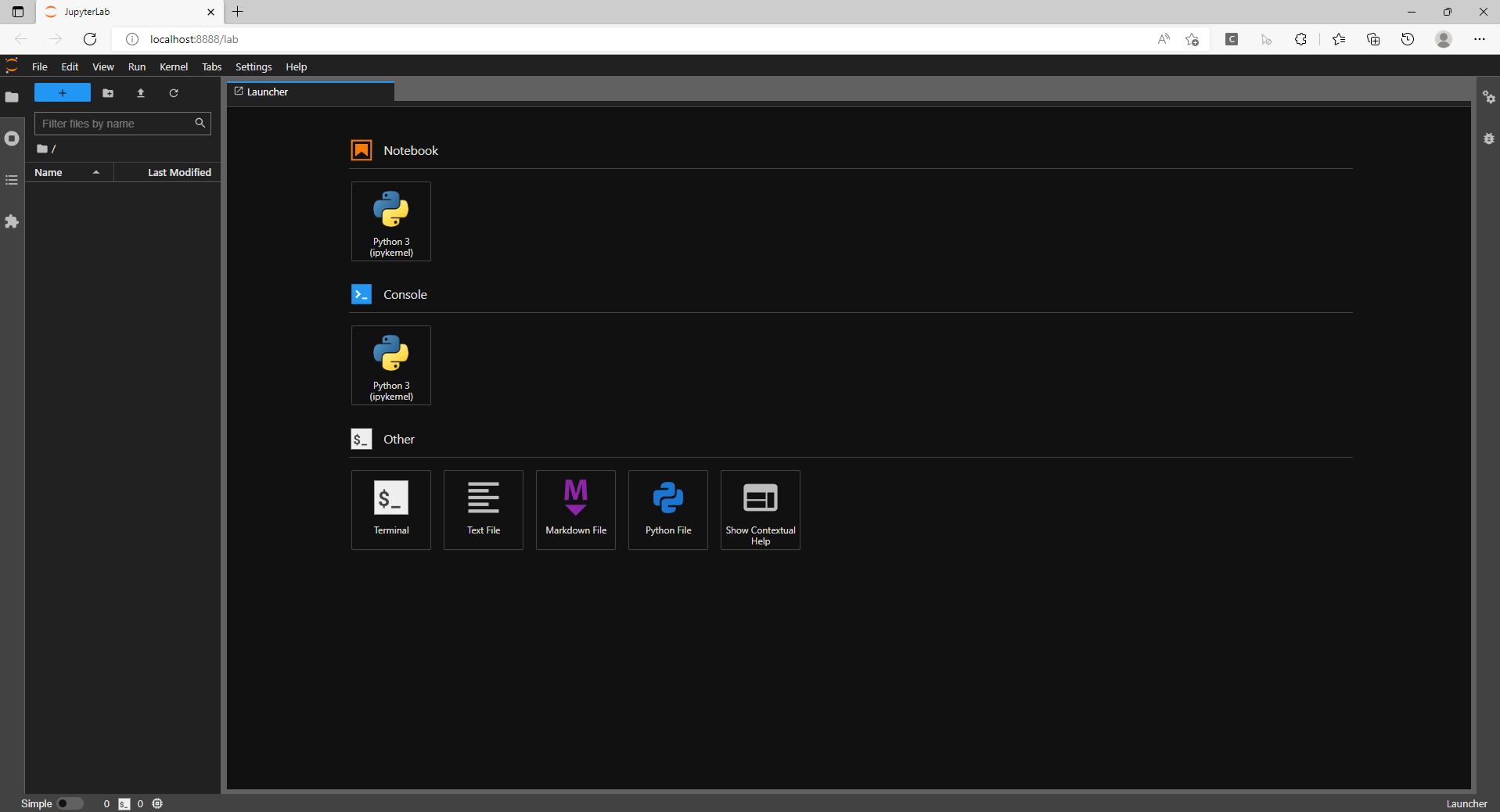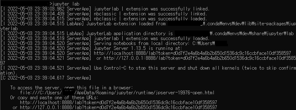 - 위와 같이 jupyter lab 환경을 실행 할 로컬 서버가 동작이 되됩니다.